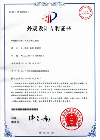 • 氣壓檢漏試驗機-外觀專利證書【岳信公司】